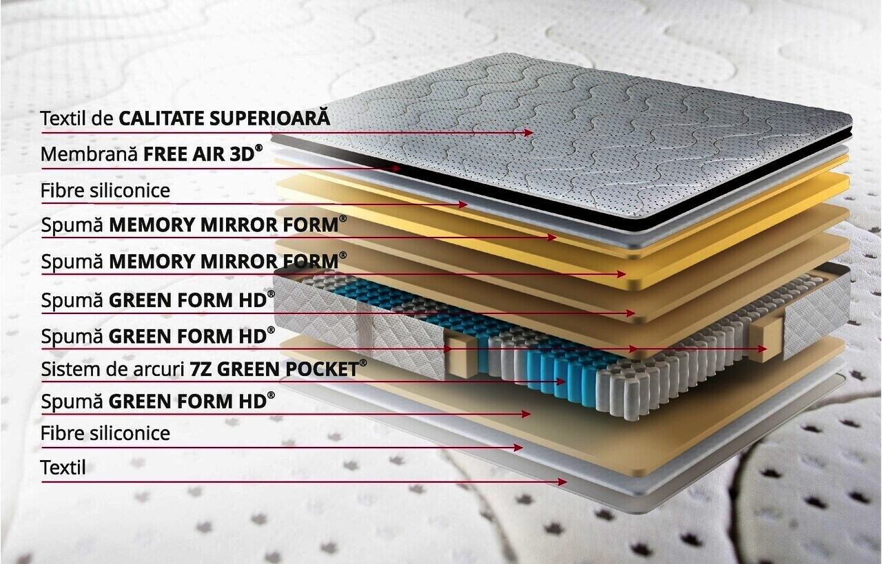 Tehnologia avansata a sistemului de Arcuri 7Z Green Pocket® impreuna cu cea a stratului de Green Therm Memory® asigura un somn fara propagarea miscarilor partenerului.