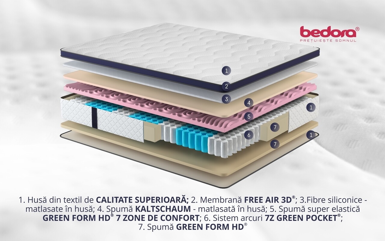 Sistemului 7Z Green Pocket® i se mai adauga si spuma elastica Green Form HD® cu celulatie deschisa si 7 zone de confort ce asigura o pozitie naturala si corecta in timpul somnului, prevenind astfel durerile de spate sau cervicale.