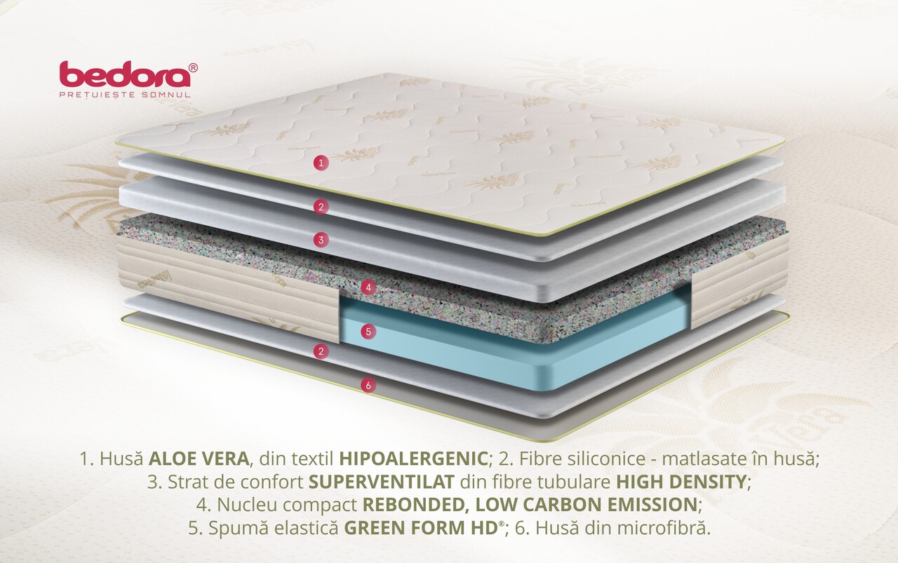 Baza saltelei ECOLINE ALOE VERA este realizata din spuma elastica Green Form HD cu celulatie deschisa. Este un material ferm si elastic, cu rezistenta sporita la utilizare, care ofera suport sporit pentru pozitia corecta a coloanei si ajuta la aerisirea saltelei.