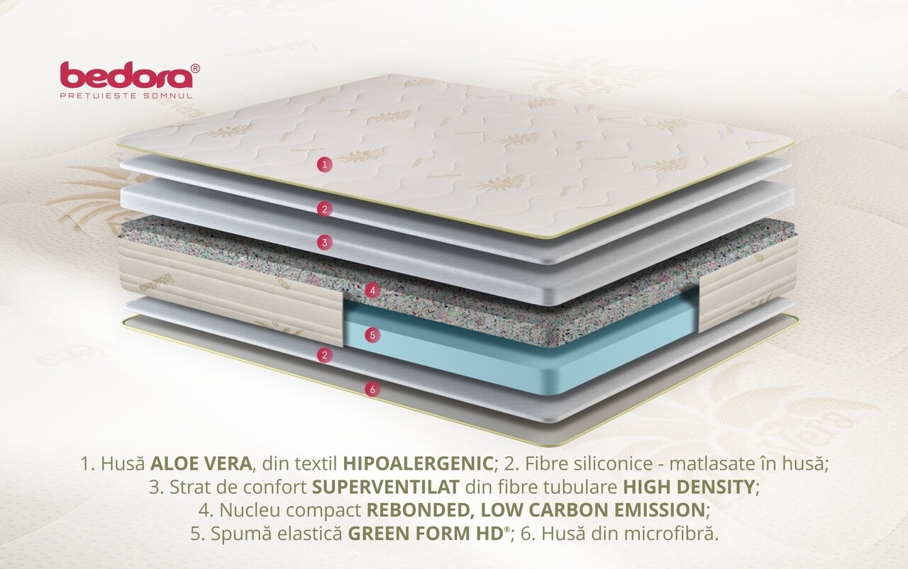 Contine saltea ce asigura suport ortopedic si una sau doua perne Aloe Vera- in functie de dimensiunea saltelei*, intregind confortul si relaxarea de care aveti nevoie.