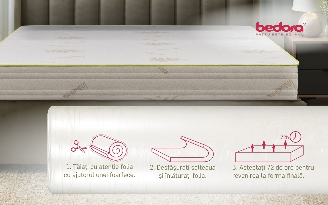 Contine saltea ce asigura suport ortopedic si una sau doua perne Aloe Vera- in functie de dimensiunea saltelei*, intregind confortul si relaxarea de care aveti nevoie.