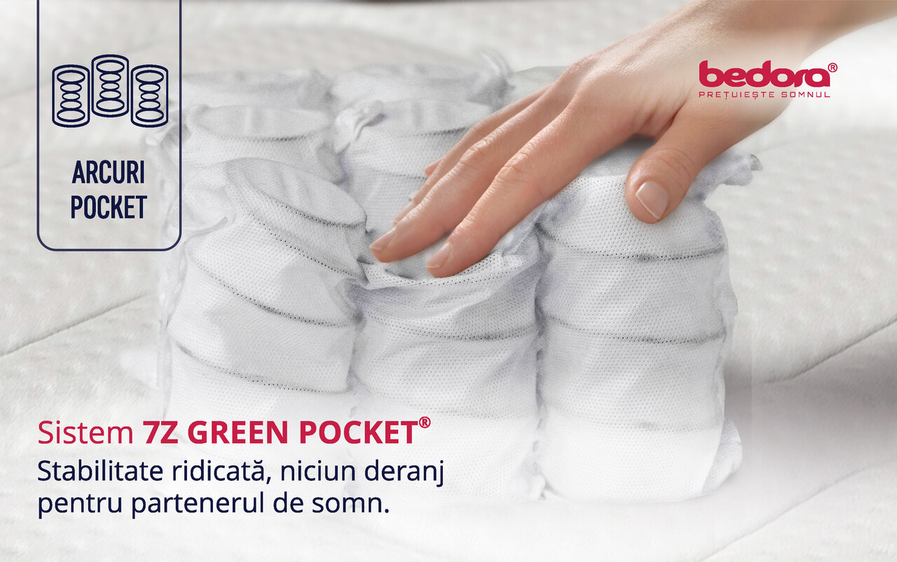 In plus, sistemul 7Z Green Pocket® permite un suport diferit al partilor corpului in functie de presiunea exercitata de acestea pe suprafata saltelei pentru a asigura o aliniere corecta si sanatoasa a vertebrelor coloanei.