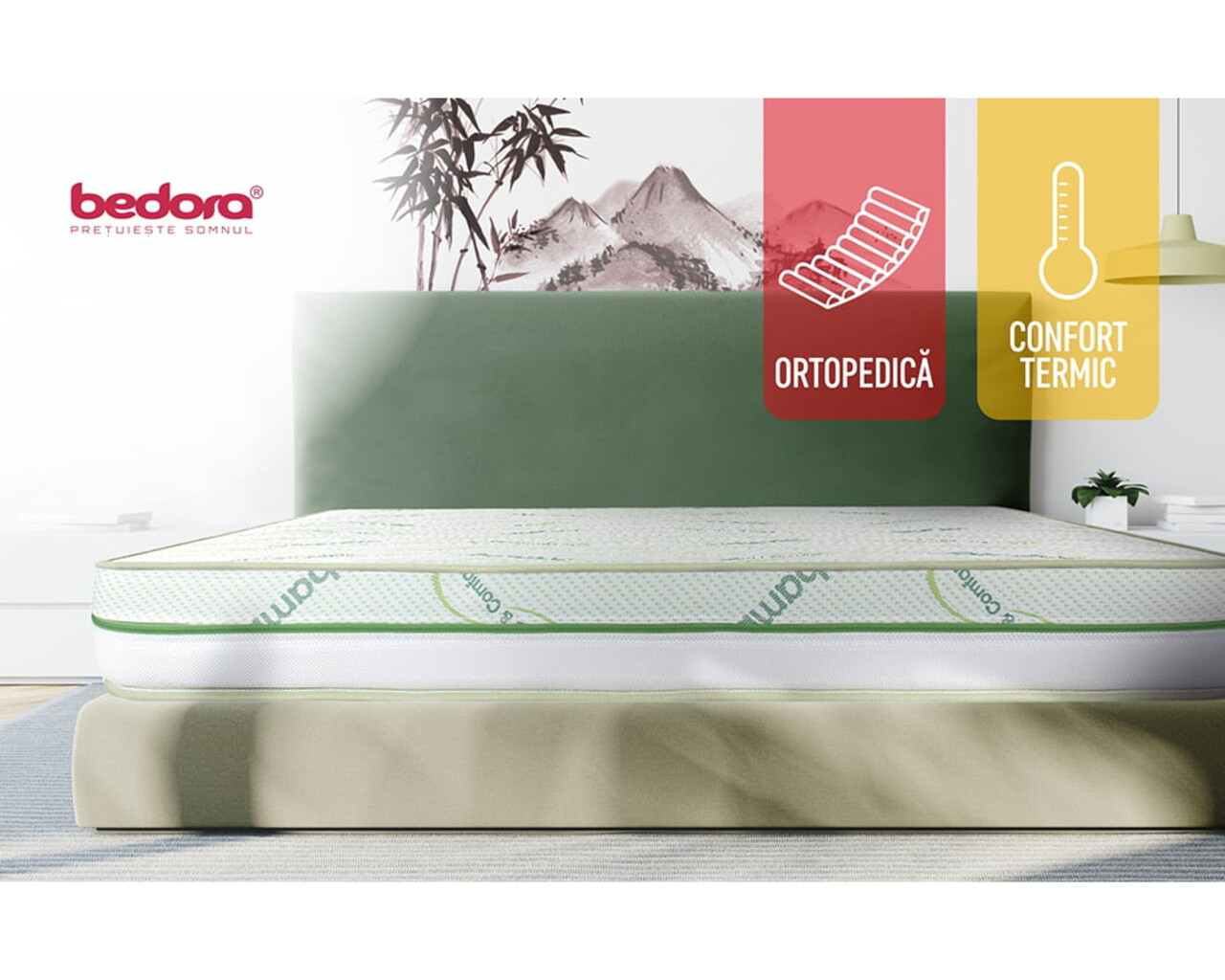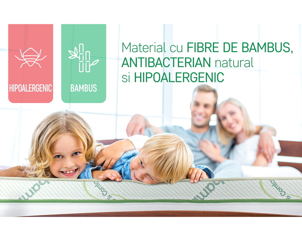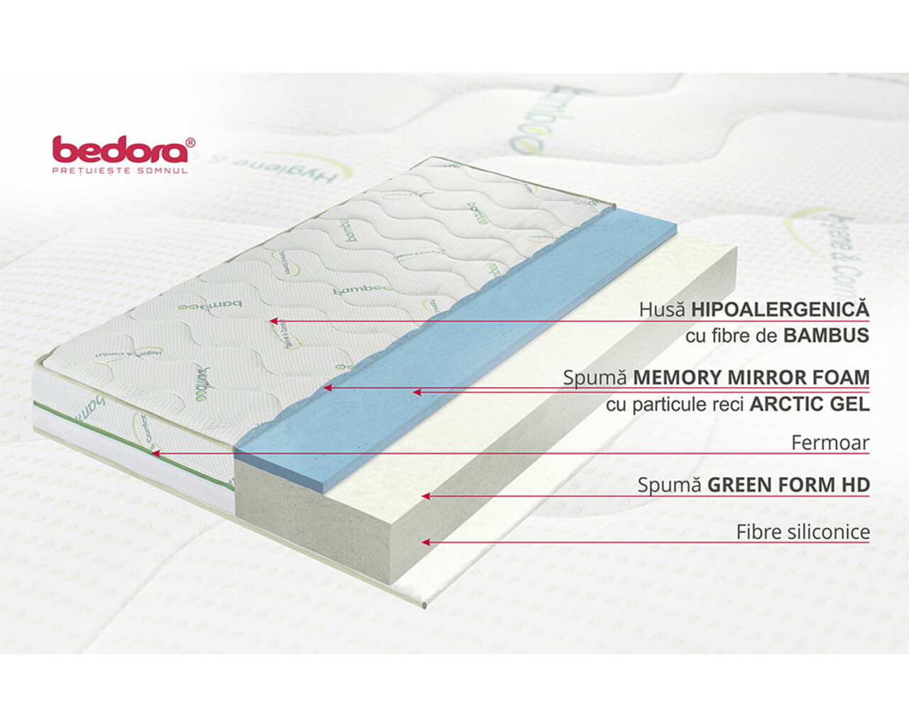 • Husa Hipoalergenica cu fibre naturale de Bambus, matlasata cu Green Therm Memory cu particule racoritoare Arctic Gel®