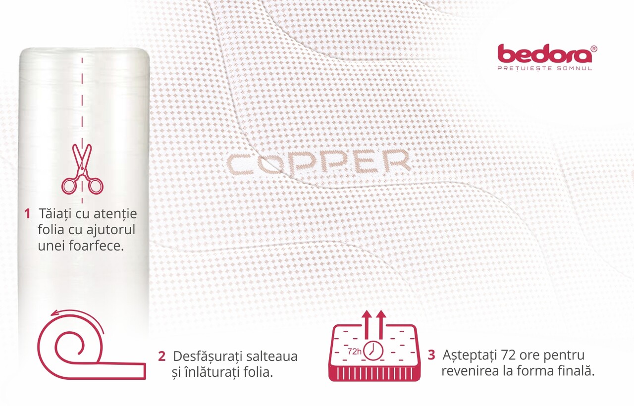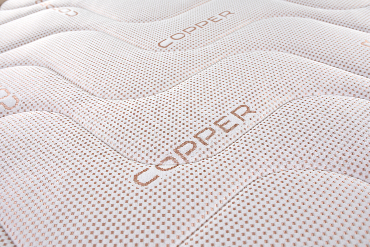 Husa cu țesătură Copper aduce multiple beneficii: cuprul integrat în material are proprietăți naturale hipoalergenice și favorizează o evaporare rapidă a umidității, prevenind astfel dezvoltarea bacteriilor pe suprafața țesăturii.