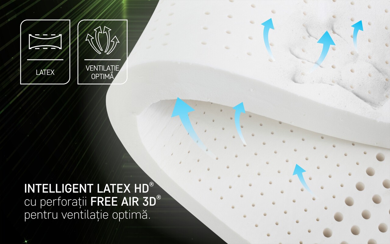 Un alt element esențial al acestei saltele este stratul de 3 cm Intelligent Latex HD® – un latex de înaltă densitate, cu proprietăți avansate de adaptabilitate și elasticitate. Acest material inovator răspunde în timp real la mișcările corpului, oferind un suport echilibrat și contribuind la menținerea unei poziții corecte a coloanei vertebrale pe parcursul întregii nopți.
