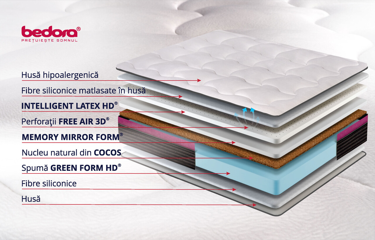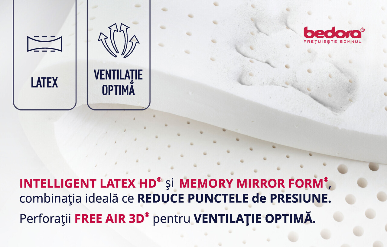 Stratul generos de 3 cm de spuma Memory Mirror Form® 7 Zone de Confort reactioneaza la caldura corpului si se muleaza pe acesta eliminand punctele de presiune pentru a relaxa muschii si a asigura o circulatie a sangelui corespunzatoare, in timp ce stratul de 3 cm Intelligent Latex HD®, prin flexibilitatea si elasticitatea lui, permite o mai buna sustinere a corpului, oferind un confort deosebit in timpul somnului.