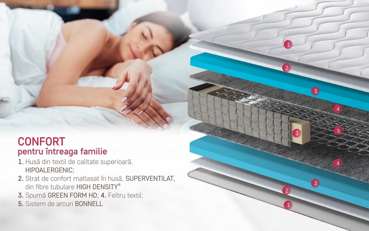Baza saltelei combina proprietatile ortopedice ale spumei elastice Green Form HD® cu rezistenta si sustinerea oferita de arcurile tip Bonnell. In completare, structura aerata a fibrelor siliconice matlasate an husa contribuie la o buna circulatie a aerului si la reglarea temperaturii corpului pe parcursul noptii, asigurand un nivel optim de confort pentru un somn de calitate.