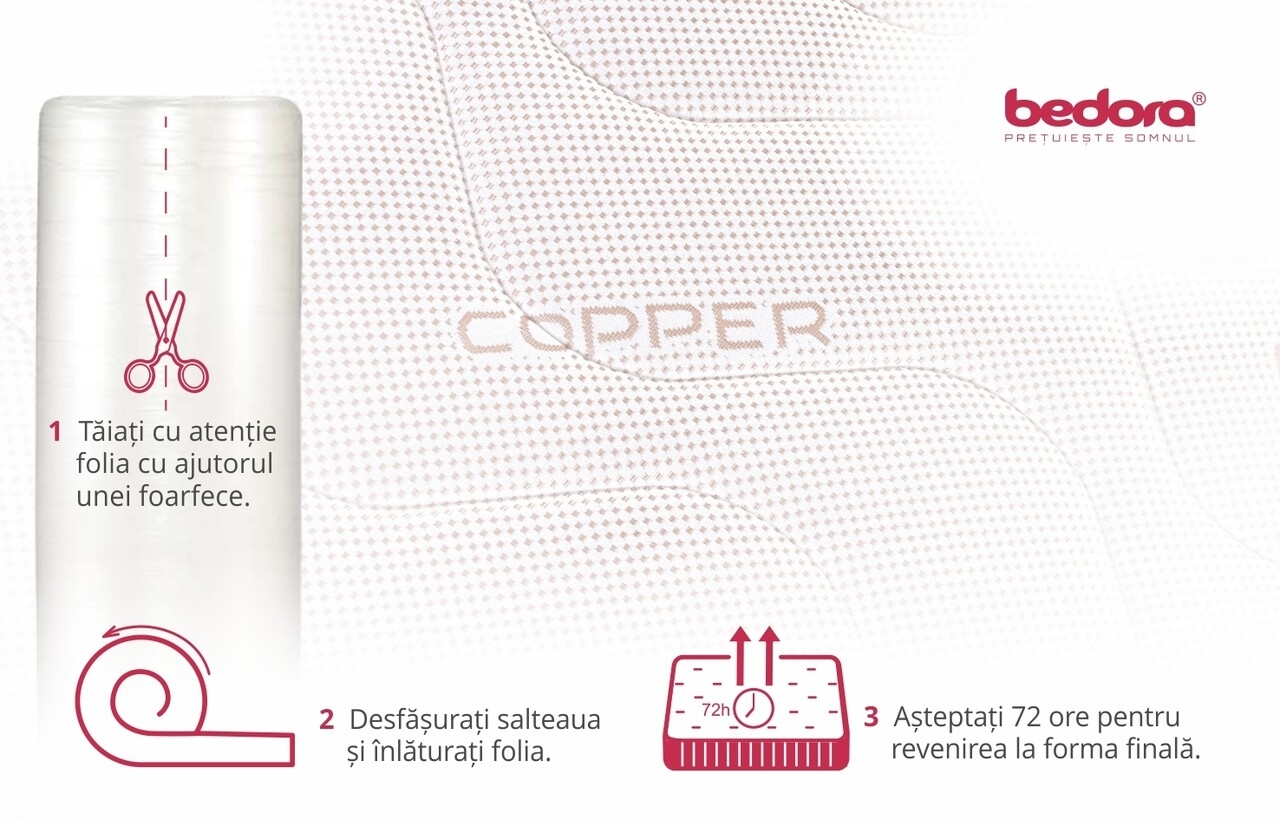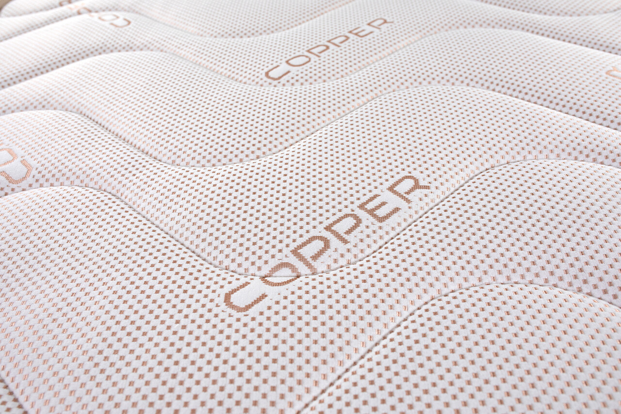 Husa cu țesătură Copper aduce multiple beneficii: cuprul integrat în material are proprietăți naturale hipoalergenice și favorizează o evaporare rapidă a umidității, prevenind astfel dezvoltarea bacteriilor pe suprafața țesăturii.