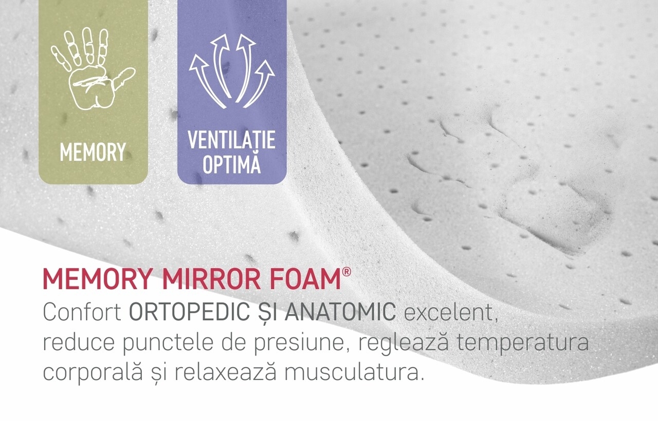 Structura saltelei este concepută pentru a oferi un echilibru optim între caracteristicile ortopedice ale spumei elastice Green Form HD® și proprietățile termice ale spumei Memory Mirror Foam®. Stratul de confort realizat din Memory Mirror Foam® include perforații de ventilație pe întreaga suprafață, asigurând o aerisire adecvată și menținând un mediu uscat, fără acarieni, pe durata somnului.