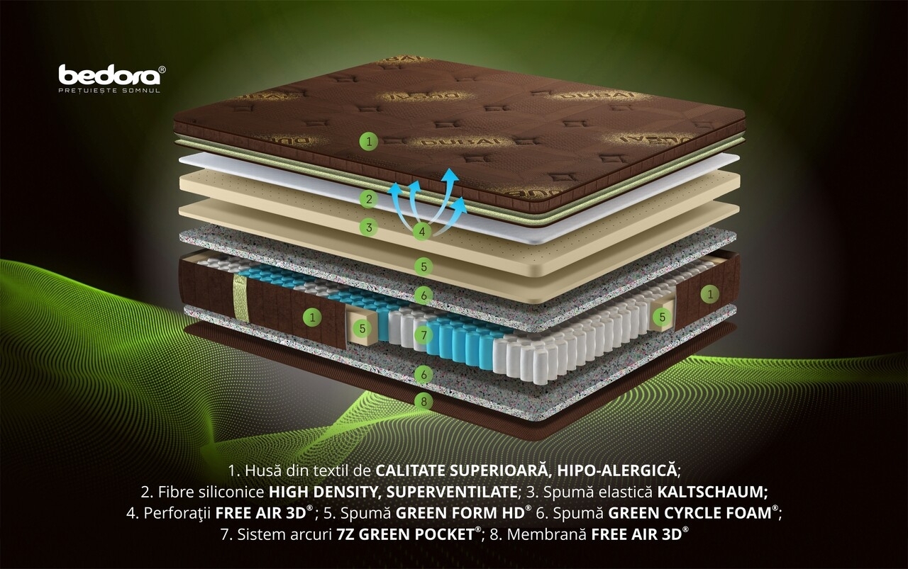 Datorită funcționării independente a arcurilor, mișcările nu sunt transmise de la o zonă la alta, oferind astfel o stabilitate excelentă și eliminând disconfortul cauzat de mișcările partenerului. În plus, sistemul 7Z Green Pocket® asigură un nivel diferențiat de susținere pentru fiecare zonă a corpului, în funcție de presiunea exercitată, contribuind la o aliniere sănătoasă a coloanei vertebrale și un somn fără tensiuni.