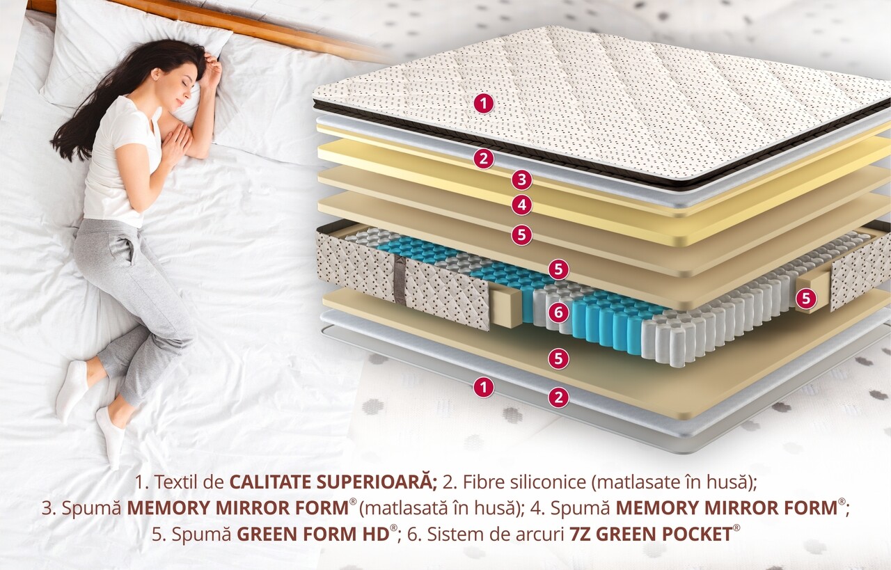 Tehnologia avansata a sistemului de Arcuri 7Z Green Pocket® impreuna cu cea a stratului de Green Therm Memory® asigura un somn fara propagarea miscarilor partenerului.