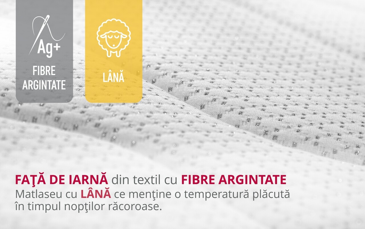 Fata de iarnă, realizată dintr-un textil cu fir argintat, este matlasată cu lână Merinos, un material natural care reglează temperatura corpului, având capacitatea de a absorbi și elibera umezeala, asigurând astfel o izolare termică optimă și confort pe tot parcursul nopții. Stratul Memory Mirror Form® completeaza confortul in timpul somnului.