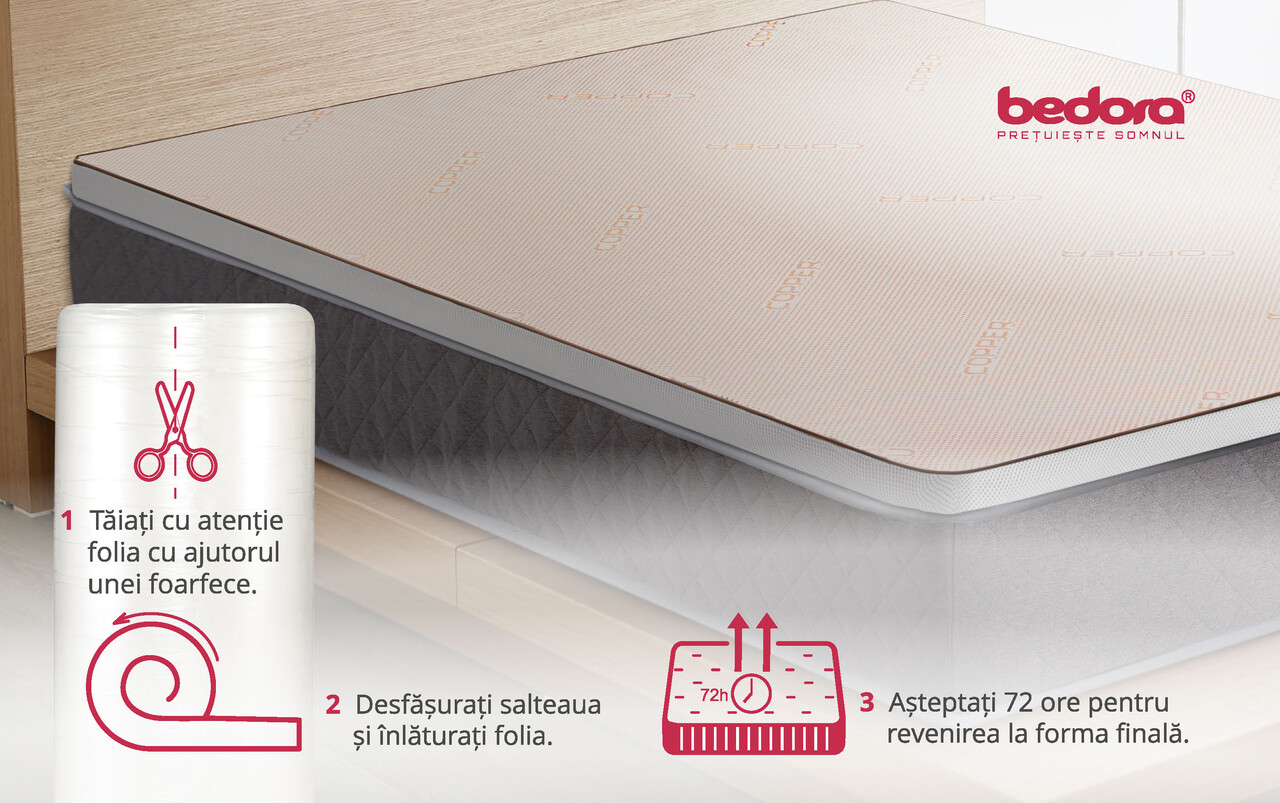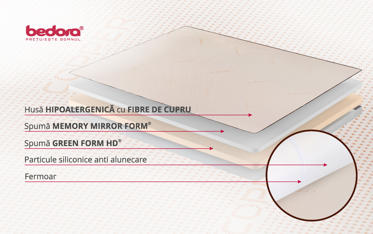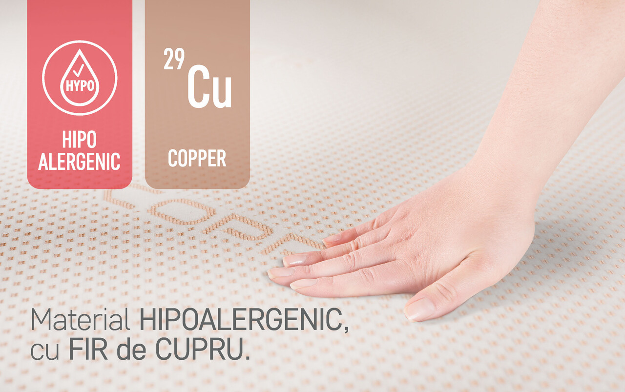 Topper-ul Copper Memory Free Air este conceput din spumă poliuretanică Green Form HD® cu structură cu celulație deschisă și spumă Memory Mirror Foam®, oferind o adaptare perfectă la conturur corpului. Această combinație inovatoare ajută la reducerea punctelor de presiune în timpul somnului, la relaxarea mușchilor și susține o circulație sanguină optimă pentru un somn odihnitor.
