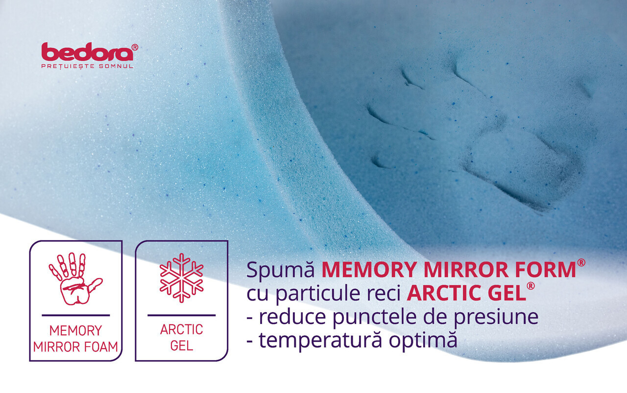Structura topper-ului este formata din doua straturi de spuma poliuretanica: un strat din spuma elastica Green Form HD® cu celulatie deschisa si un strat de spuma Green Therm Memory cu particule reci Arctic Gel® care previn supraincalzirea in timpul somnului si se muleaza pe corp eliminand punctele de presiune in timpul somnului pentru a relaxa muschii si a asigura o circulatie a sangelui corespunzatoare.