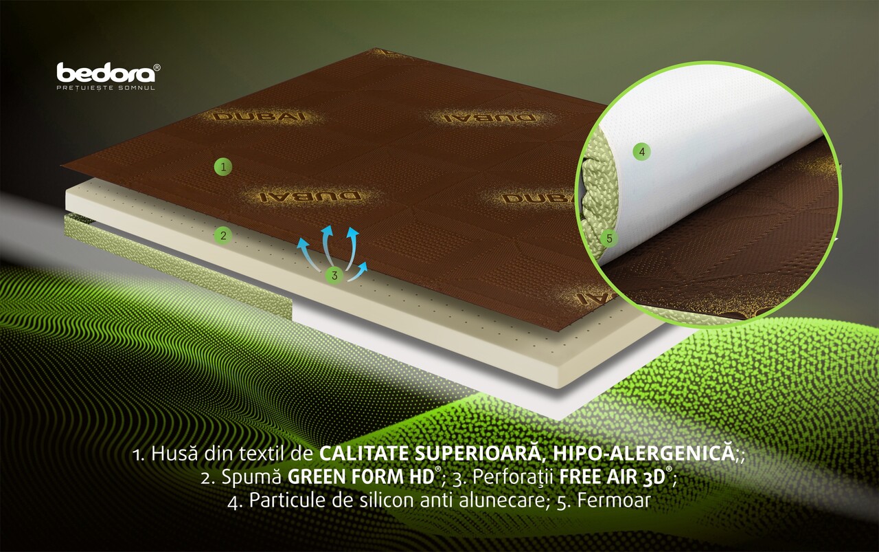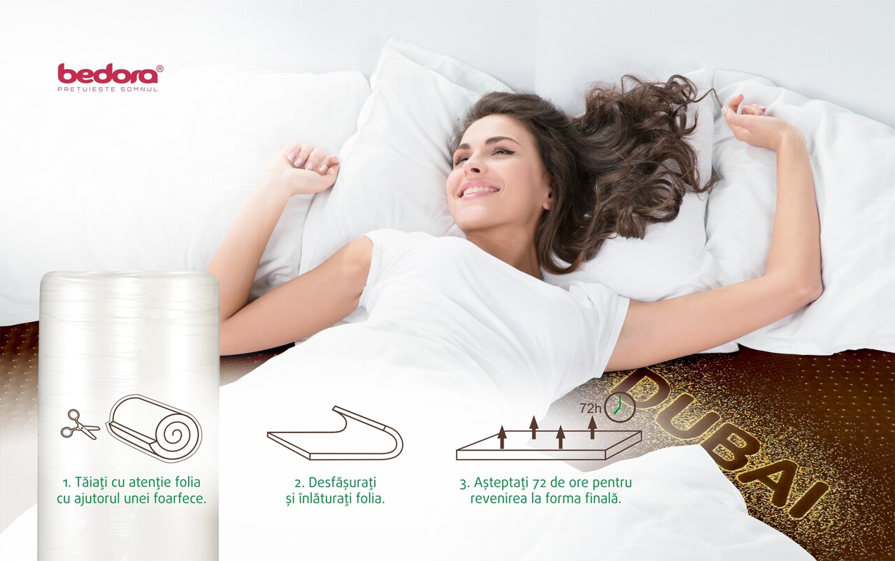 Topperul Dubai Moment contribuie la distribuirea uniforma a greutatii, la reducerea punctelor de presiune si la crearea unui mediu mai placut pentru odihna. Realizat din materiale de calitate, care permit o buna circulatie a aerului si se adapteaza formelor corpului, topperul Dubai Moment este solutia ideala pentru un somn mai profund, mai relaxant si mai revigorant.