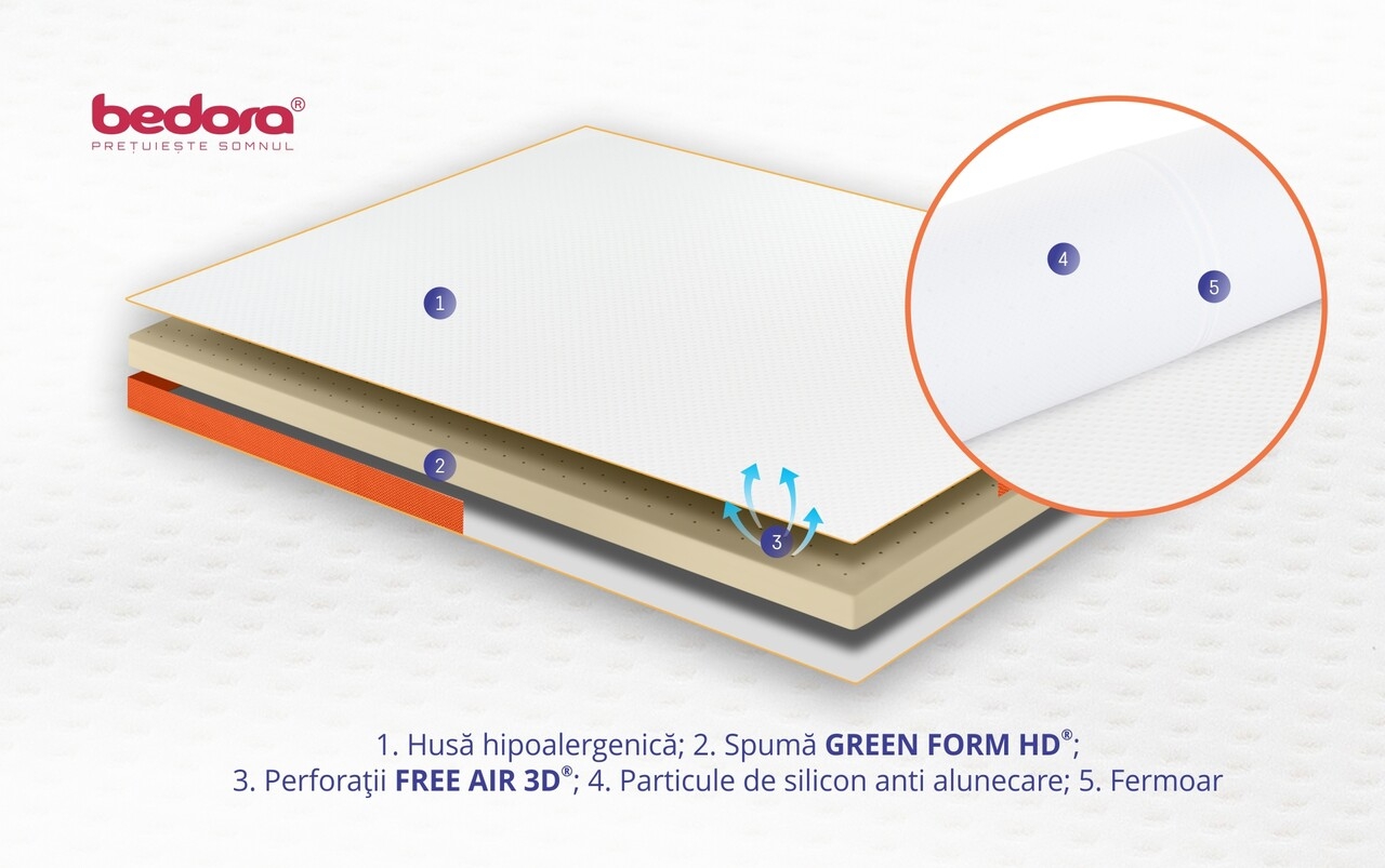 Ventilație optimă: Stratului de spumă poliuretanică Green Form HD îi sunt adăugate găuri de ventilație distribuite uniform pe toată suprafața, ceea ce permite o aerisire eficientă. Acest sistem de ventilație asigură un flux de aer constant, menținând un mediu uscat și sănătos, ideal pentru un somn odihnitor. Astfel, se previne acumularea umezelii și dezvoltarea acarienilor, contribuind la un mediu mai igienic și confortabil pe toată durata nopții.