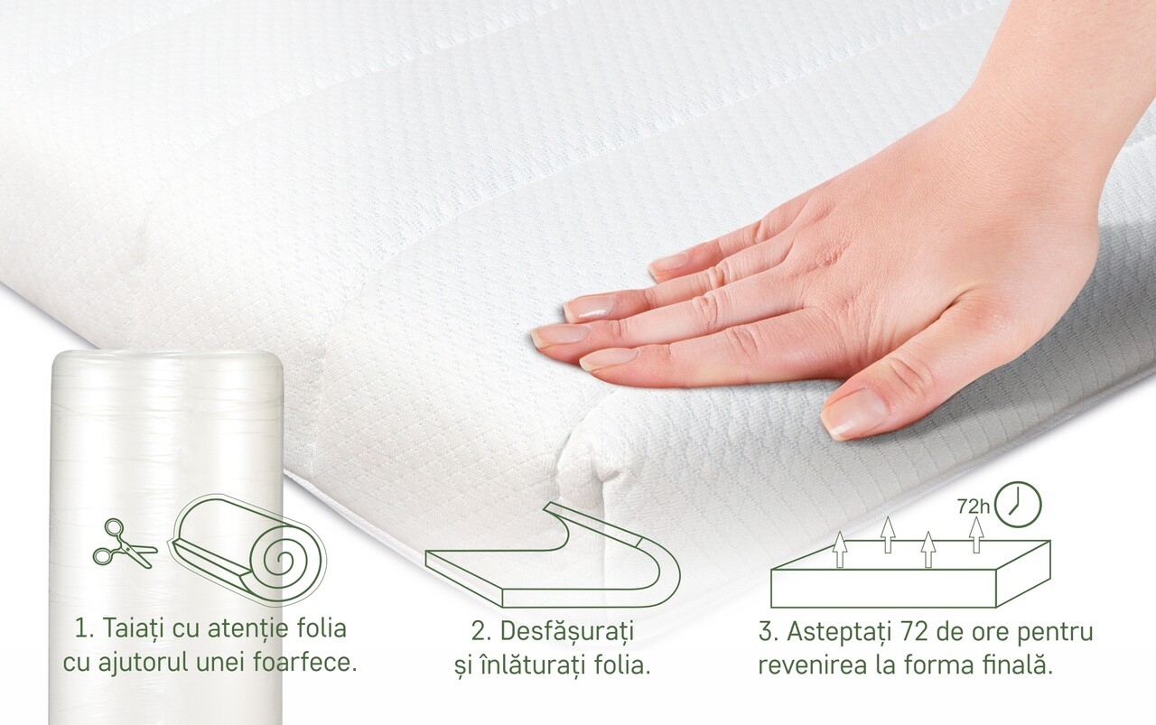 Topper-ul Harmony este realizat din spumă poliuretanică Green Form HD® cu celulație deschisă, care se adaptează perfect formei corpului, reducând punctele de presiune în timpul somnului. Acesta contribuie la relaxarea mușchilor și la o circulație sanguină optimă.